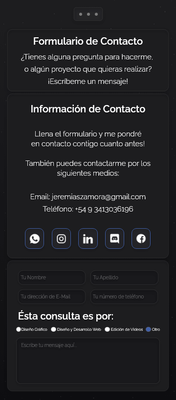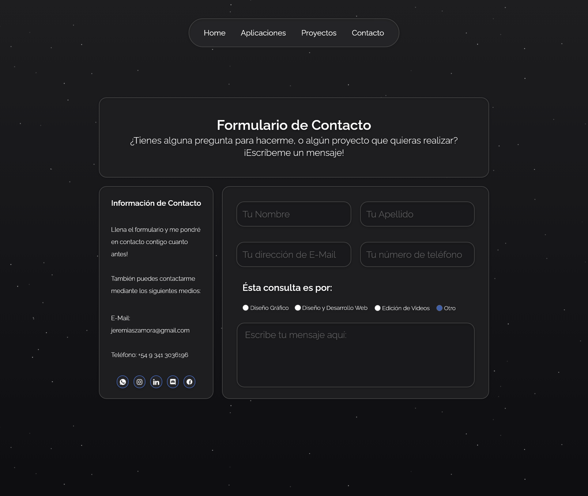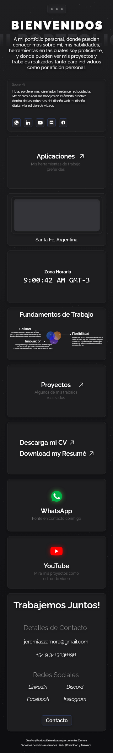 Creé éste sitio poniendo en práctica mis conocimientos de HTML y CSS para el maquetado y la definición de estilos, junto con JavaScript aplicado en secciones específicas para añadir funcionalidades adicionales; como un reloj digital para indicar mi horario local, y un sistema de confirmación para la recepción de los Emails enviados a través de mi formulario. También incorporé el Framework Astro para facilitar el flujo de trabajo y priorizar la agilidad en el tiempo de carga de ésta página.